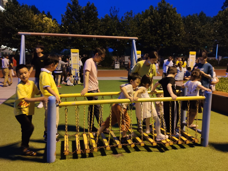 另外如果让孩子们在户外尽情玩耍,可以增强彼此接纳、培养友情的机会,即便是有问题或是孤僻的学生,户外活动多了,他们也就变得喜欢与同学分享,我们只是要注意孩子们的安全。所以说,为了孩子有个健全的身心,我们就多让他们在户外自由地玩耍吧!图为夜幕下淮海农场的孩子们在健身器材上玩耍时的镜头。