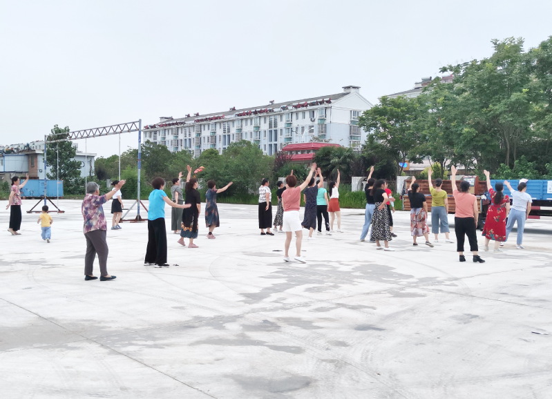 与此同时,农场社区除在职工休闲体育运动广场外,还在淮海公园、文广苑小区、幸福小区、城西居委会等多地广场及小区间安装了整套健身器材,不仅给居民提供了休闲之余强身健体的平台,还给小区增添了一道靓丽的健身体育风采。图为城南社区职工在修理厂门前的广场上开辟新跳舞战场时的镜头。