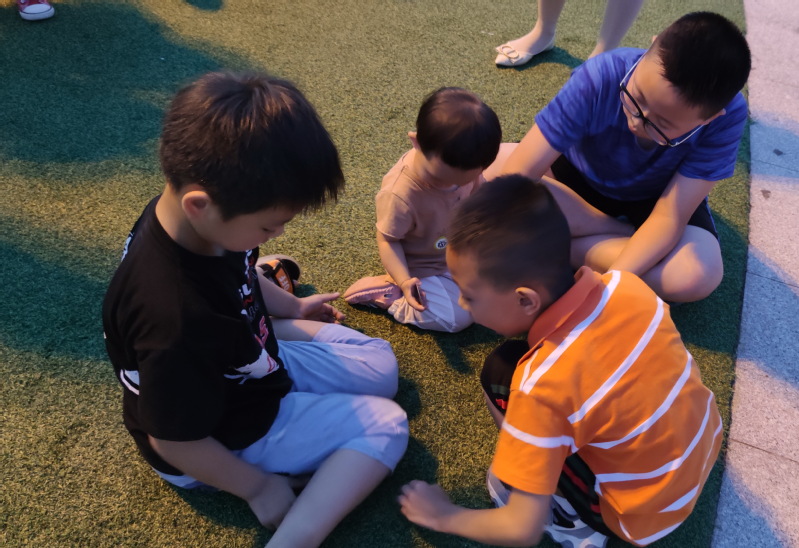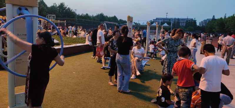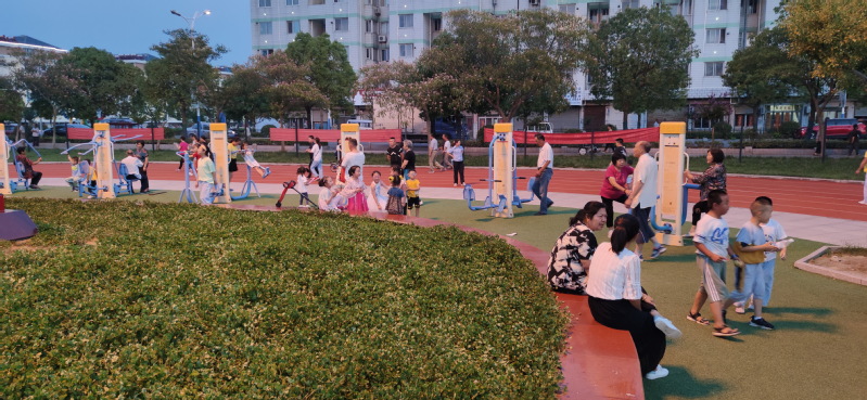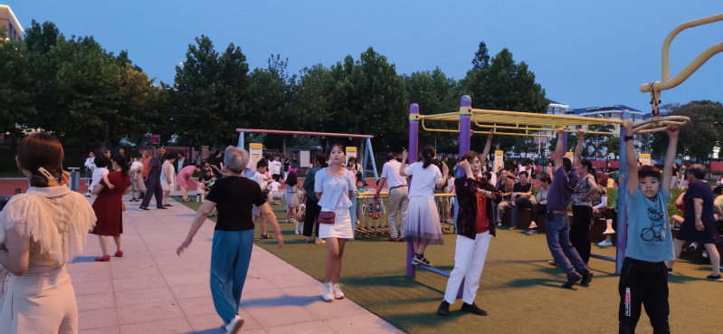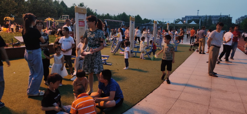 淮海职工休闲体育运动广场是农场人气最旺盛的健康体育运动广场,不仅农场的职工居民和周边农村群众趋之若鹜,纷至沓来地来到这里进行各类健康体育运动,进行锻炼身体、休闲养生。这里也是职工群众最喜爱游玩的好去处。不仅成年人喜欢,也是孩子们的乐园。昨天晚上我们看到,在广场上的健身器材区域,是孩子们最喜爱的地方,这里不仅有孩子们喜欢的健身器材玩,并且地面铺设的塑胶地面,也让他们在上边开心的玩耍着。你看,那些小孩子们团坐在地上,玩着掼纸片的游戏,多专注;那边几个孩子们一同说着悄悄话,多悠闲;健身器材上的几个孩子像模像样地摆弄着器材,锻炼着身体;还有许多幼童在家长们的监护下,进行交流或是玩耍。广场上到处都散发着童稚的芬芳和蓬勃的气息。