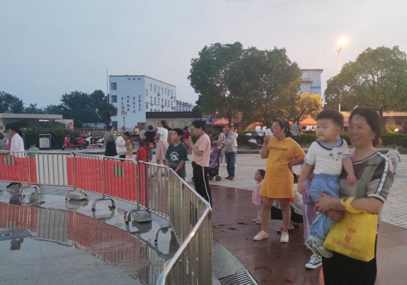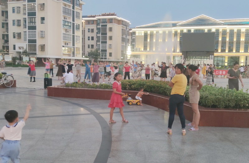 “每次我们上体育运动广场上的健身器材上去健身后再路过这里,孙女就非要拉着你的手来到这里看音乐喷泉,并且这里的孩子很多,于是就让孩子们吸引过来。”淮海学校老师周永林说,“看到孙女玩得高兴,我们听的看的也非常开心,农场的健康体育文化广场,也为我们生活添加更多色彩和欢乐。”图为淮海文化广场上职工居民在活动时的镜头。