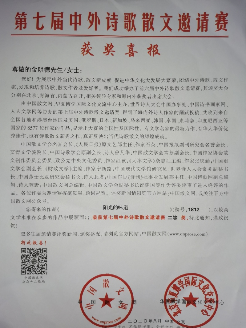 日前,笔者获悉,原常州下放新洋农场知青金明德荣获第七届中外诗歌散文邀请赛二等奖。据悉,该比赛第七届中外诗歌散文邀请赛由中国散文网、华夏博学国际文化交流中心主办,世界诗人大会中国办事处、中国诗书画家网、人人文学网协办。