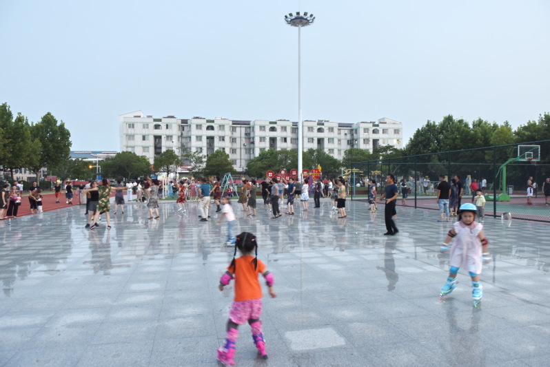 每天傍晚,在淮海农场文化广场和职工休闲体育运动广场上,就是拥进了众多的周边职工居民和地方群众,他们共同来到广场上,进行跳舞、散步、跑步、器材运动、篮球、舞蹈等适合自身需求的体育运动,让农场的两大广场变成了欢乐的海洋。我们看到,有以中老年舞蹈爱好者汇集于此,踏着悦耳的节拍跳起欢快的广场舞的;有年轻一点的职工居民,在爽滑的舞蹈池上,跳着专业的交谊舞的;也有的职工居民带着老人或是小孩,在广场上散步游玩的。他们各自的身姿和热烈的气氛引来观众钦羡的目光。特别是每天上演的广场舞健身操,在广场的四五处区域不同上演,成为淮海夜晚最美的风景。广场舞健身操的普及,让不少路人也愉快地加入其中载歌载舞,队伍逐步扩大,让更多的职工居民融入到农场健康体育文化之中,享受着我运动、我健身、我快乐的体育运动氛围。图为职工居民在广场上运动的姿态和身影。