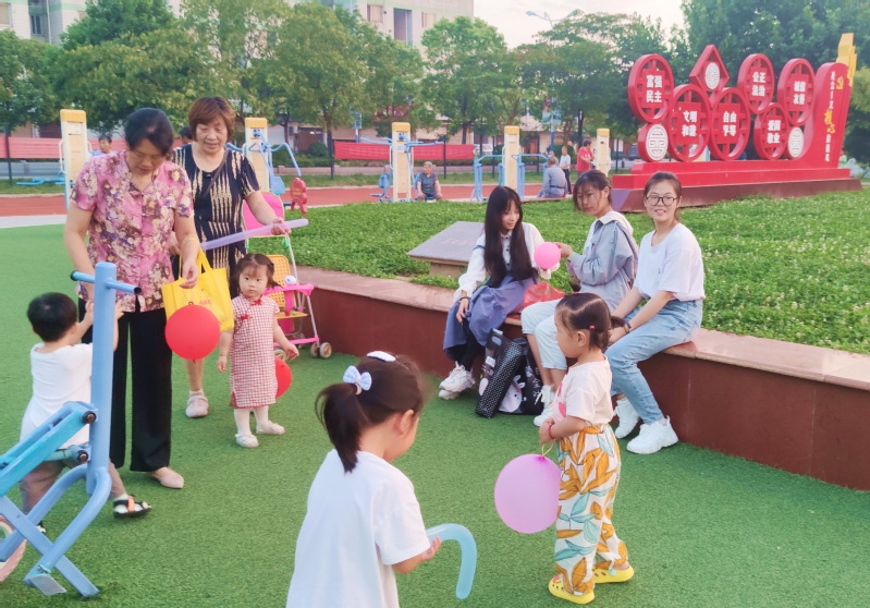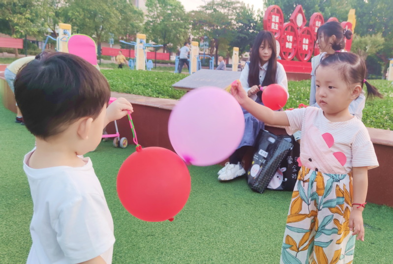 9月4日傍晚,在淮海农场职工休闲体育运动广场健身器材包裹的椭圆形的大理石上,由淮海农场中学的三名学生正坐在上面一边吹着气球、一边把色彩斑斓的气球或是气棒派送到前来索要的宝妈宝奶或是宝宝的手中,并以此来锻炼体验与社会交往的能力,并在人际交往中奉献爱心,体味人性的温暖。