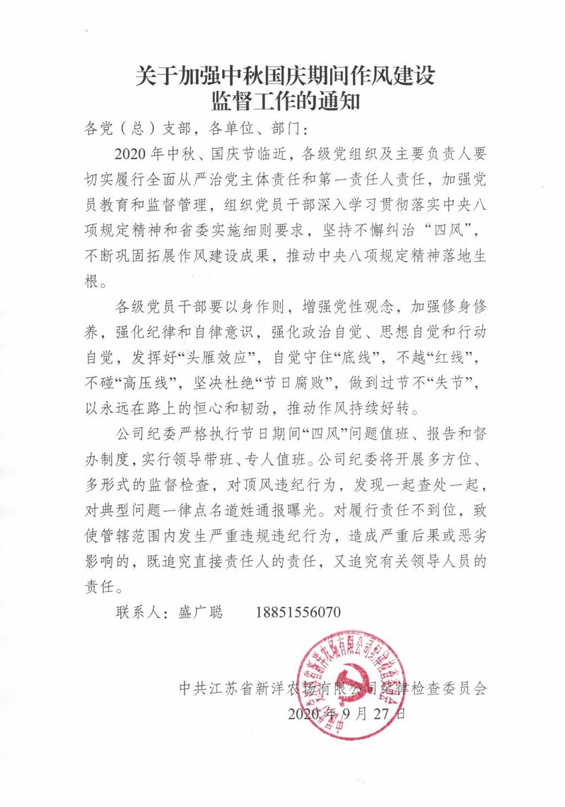 9月29日,新洋农场有限公司纪委在公司管理人员微信群发布了一条《关于加强中秋国庆期间作风建设监督工作的通知》,党员干部纷纷转发学习。“双节”期间,新洋纪委以“钉钉子”精神狠抓作风建设,严把廉洁关,通过敲响节日“廉洁警钟”,确保党员干部守住底线,廉洁过节。