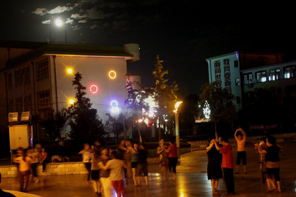 明月洒下一片皎洁的月光,与世纪广场上的彩灯交相辉映,映照在热舞中的男男女女身上,泛射出缤纷五彩,犹如是飘逸的彩云,在追逐天上的明月。