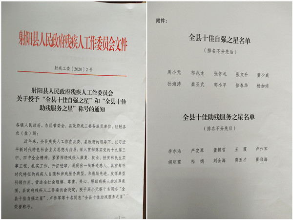 日前,从射阳县人民政府残疾人工作委员会传来消息,新洋农场有限公司水电经营管理服务中心主任郭小平荣获“全县十佳自强之星”荣誉。
