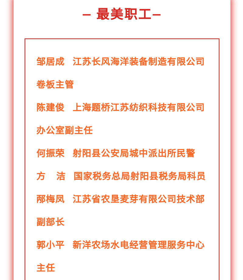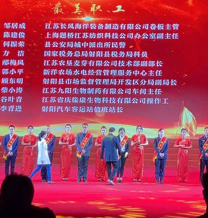 11月19日晚,射阳第十四届丹顶鹤文化艺术节暨经贸洽谈会举行第七届“最美射阳人”评选揭晓活动。活动现场,表彰了“最美道德模范”“最美赤子”“最美创业精英”等十一大类先进典型,农场职工郭小平荣获“最美职工”称号,登台接受表彰。