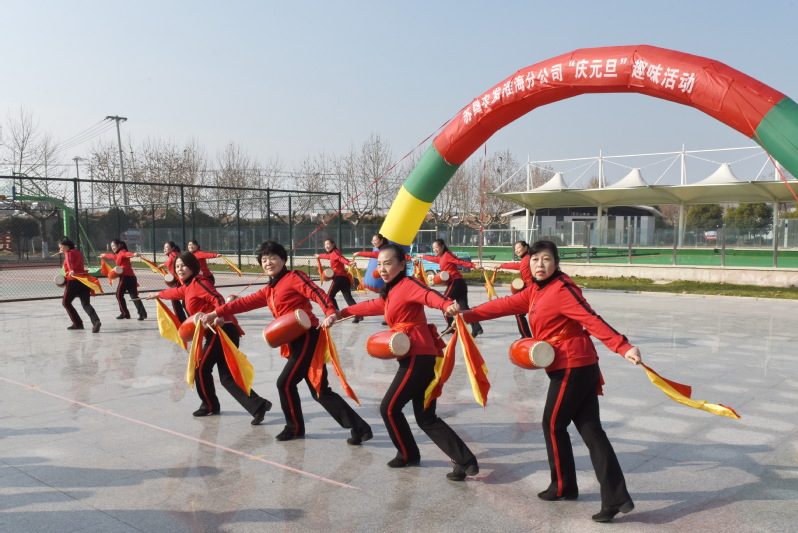 为迎接2021新春元旦的到来,帮助苏垦农发淮海分公司和淮海农场公司工会营造趣味运动会的气氛,由淮海海之韵舞蹈队这支平均年龄在57岁的12名队员,义务为企业进行鼓舞趣味运动会的开场舞表演,并以击鼓舞蹈的形式,为参赛节目助兴,给现场近500名参赛选手和职工群众营造出了浓郁的节日氛围。