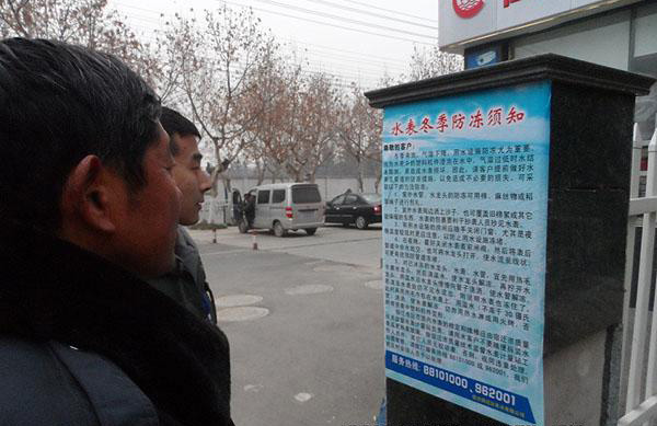 各用水单位、小区物业公司完善小区地下室、楼梯间、次供水泵房的防寒保温工作,对透风的门、窗、地下室通道、管道井、孔、洞等进行封堵,加强对管道、供水设施以及防寒帘等保温设施的巡查,发现管道结冰或损坏及时抢修。极端寒冷气温下,针对入住率很低的小区,水务公司暂停供水并及时排空管内余水,防止造成大面积供水设施的冻坏届时通过定时送水或临时取水的方式保障居民基本用水需求。
