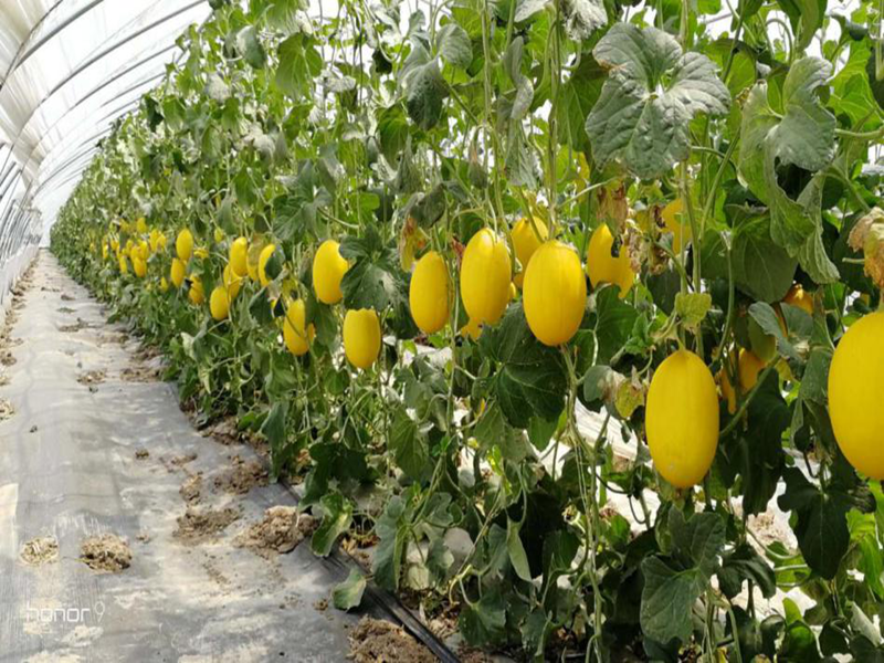 预计采收前的3~5天,及时去除套袋,增加果皮色泽和亮度。成熟期采收标准,果肉糖度达到16%以上,果皮金亮有光泽,坐果后生长期38~40天就可以采收了。由于“黄金蜜”甜瓜品种成熟期有容易裂果的特点,做好坐果期记录,采收临界期注意观察果皮变化,尽快采收。采收时,不用剪刀绞蔓,可以直接用手提着果柄向上以掰就可以断蔓。采收下来的果柄,保留丁字形,然后套好网袋及时装箱、装车出货。