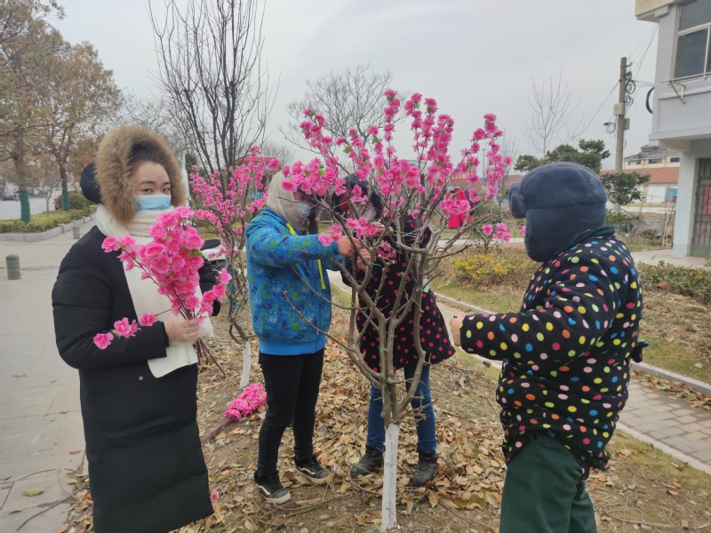 为提升文明单位的整体形象,为营造美丽淮海的生态环境,同时给传统新年增添浓郁的新春气息,淮海农场社区绿化环卫所的员工们,以淮海公园、路边公园、机关大院、居民小区等处的各种树木枯枝为阵地,通过在修剪整齐的树枝上布置色彩鲜艳的仿真花卉,让农场的主干道旁的微型公园、淮海公园和机关大院、居民小区等处的环境美丽起来,配合周边场所的设施,使其成为冬日里一道亮丽的风景线。图为绿化环卫所的员工正在布置鲜花和布置完成后枯枝鲜花开放时的镜头。