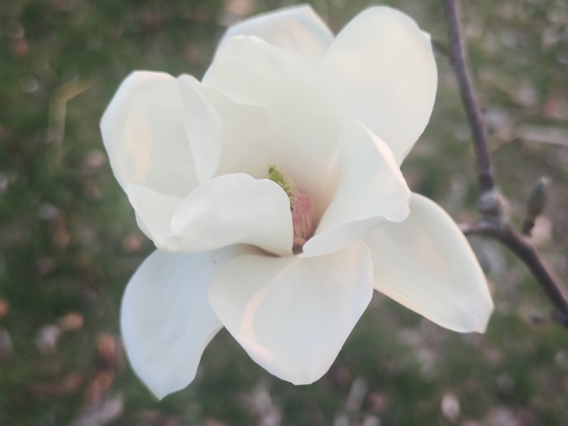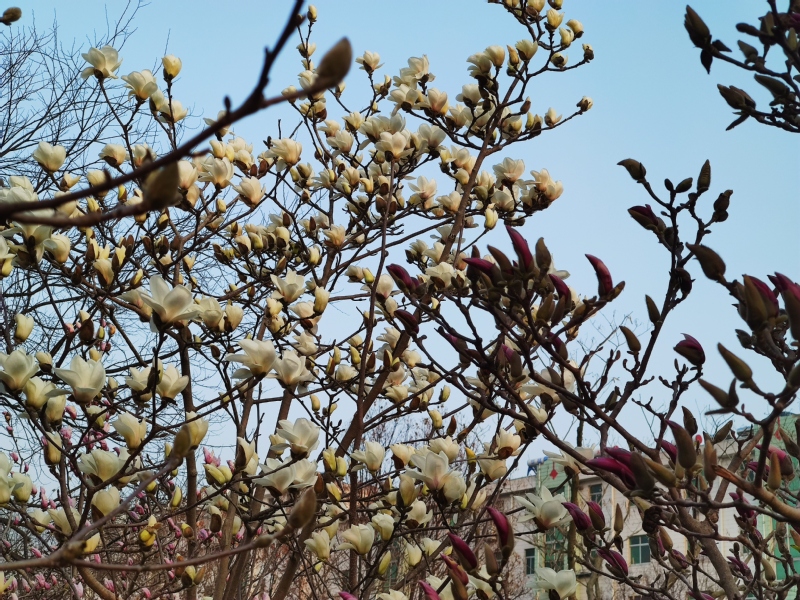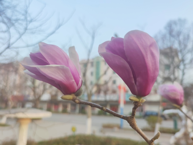 在淮海农场农业银行前的路边公园内,原本光秃的几株树枝上苞蕾鲜艳,有开着白花的,有乳白花色的、还有那紫红色花蕾的,几种花色的玉兰花渐渐开放,刹是好看,让人大有一种“忽如一夜春风来,千树万树梨花开”的感觉。只是平时不知道它的存在,而当到了三月花开,芳香四溢之时,人们才会留意着它的芳香和美丽,也会在这时,人们才会打听起它的名字 。玉兰花既是农场淮海路旁的一道美丽风景,更是绽放在人们心间的一抹风情。