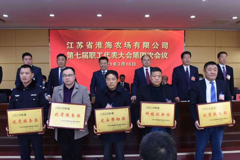 3月16日上午,在淮海农场有限公司召开的江苏省淮海农场有限公司第七届职工代表大会第四次会议上,淮海公司6名代表参加了农场公司召开的职代会活动,在先进单位表彰环节,淮海有限公司再获2020年度龙头带动奖,这是该公司在2014年在基地农场获得品牌建设先进单位,2015年获农场品牌贡献奖,2016、2017、2018、2019年获龙头带动奖后的又一殊荣。图为公司总经理姜国平上台与获奖单位集体合影时的镜头。
