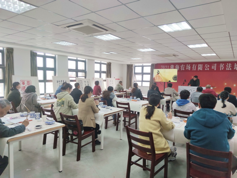 为推动企业文化建设,更好地彰显文化氛围,提高农场公司职工业余书法水平,4月27日上午,淮海农场有限公司工会主办、淮海书画协会协办的2021年江苏省淮海农场有限公司书法培训班在农场社区职工文化活动中行举行,培训班特邀中国和江苏省书法家协会会员、江苏省青少年书画协会理事、盐城市书法家协会理事、滨海县书画家协会副主席、滨海县芦花草堂书法院院长和书法培训学校校长左克成前来授课。农场公司20多名书法爱好者参加了培训班。图为开班时左克成在讲课时的镜头。