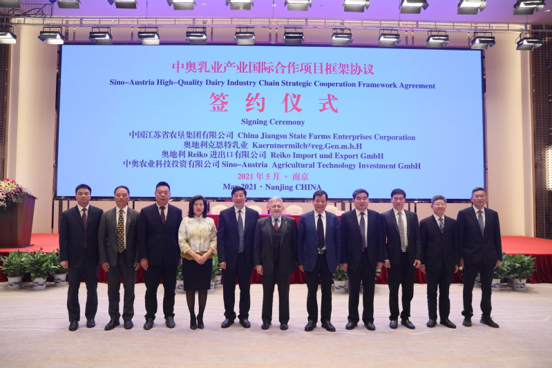 彼特勒对在江苏和南京期间中方所给予的各种支持和帮助表示由衷的感谢,并介绍了中奥乳业国际合作项目的目标和理念。他说,中国各级政府和部门在“十四五规划”中都特别重视农业问题,特别关注环保承受力和高品质的乳制品生产,既要长期应对满足一个城市,一个区域,乃至一个国家人口对奶制品的供给侧平衡,又要符合国际竞争中蓬勃发展的出口经济的国际标准。江苏农垦是一家卓越领先的大型国有公司,在开发新农业技术应用和管理系统方面拥有丰富的经验,而奥地利克恩特乳业的新鲜原奶是被评为世界上品质最好的原料奶,生产约400个不同的产品。50年前的今天,中华人民共和国与奥地利共和国正式建立外交关系。他认为,国之交在于民相亲,秉承相互尊重理解和支持的合作精神,今天的签约仪式一定会为中奥建交50周年史上增添浓墨重彩的一笔。