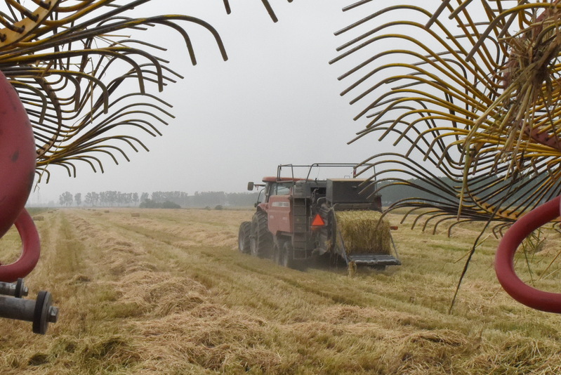 6月3日,我们在淮海农场五分场四十大队大麦收获后的田间看到,一台翻草机快速地将散落在田间的麦秸归拢成条状,一台机械打捆机随后将麦秸快速收集、压缩、打捆,并用叉车和运输车辆拖运到场地上。据测算,一捆麦秸就是一亩地大麦的草量,每捆约700多斤,一块70亩左右的农田,从收草打捆到草捆全部离田仅两三个小时,整个过程一气呵成。大麦秸秆移出农田,可以有效地提高水田的整地质量,减少因麦秸日后发酵产生的有毒气体对作物的毒害,缓解土壤的碳氮比,这对作物高产稻产十分有利。