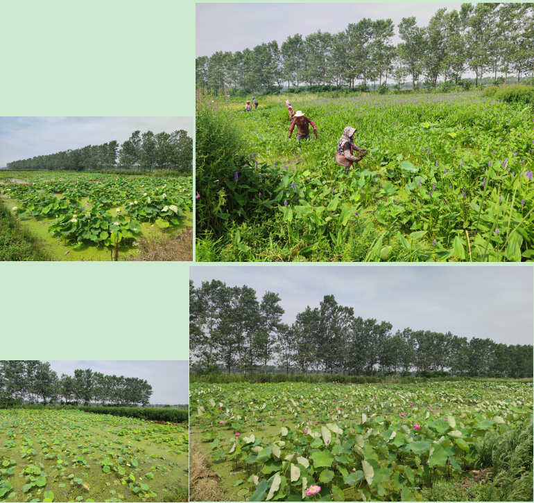 图为爱莲苑大型荷花生长的姿态和员工们正在梭鱼草田间进行劳作时的镜头。