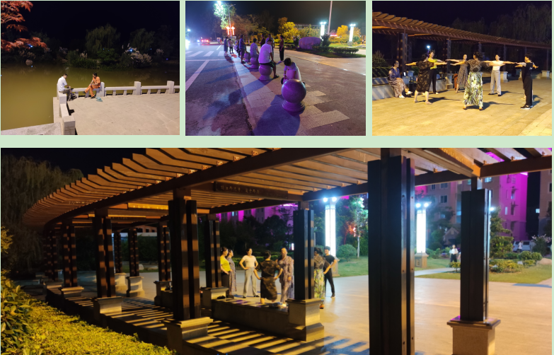 在淮海农场,当夜晚来临的时候,许多人都喜欢到淮海公园中去走一走,看一看,或坐一坐,跳一跳,因为在公园那儿,既可以与居民们相约聊天,相互散步,也可以坐在灯光下,欣赏着河岸的风光,享受下浓墨重彩的韵味。当然,也可以在怡然自得中,听一听那些舞蹈人播放的音乐,目睹下他们翩翩起舞的姿态,而对忙碌一天的居民来说,在这里可以找到最原始的放松形式,让身心的疲惫在公园中得到充分地释放。