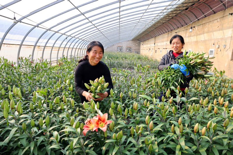 12月5日,岗埠农场富民科技园温室内,一株株绿意葱翠的百合含苞待放,花农正在忙着采摘百合销售,百合每扎(10支) 田头批发价50元左右,花农乐得合不拢嘴。