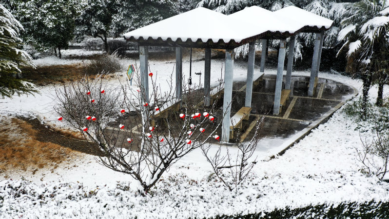 高大的银杏树、柿子树,落光了叶子的枝杈上,一条条毛茸茸、亮晶晶的银条儿好像蛰伏着的蚕虫;修长的香樟、低矮的柏树,四季常青枝叶上,一朵朵蓬松松、沉甸甸的雪球,仿佛举起的棉花糖。“呼……”一辆晨起的公交车闪着光驶过,一面面红旗也迎风雀跃起来,似乎在说“又是一个丰收年”。