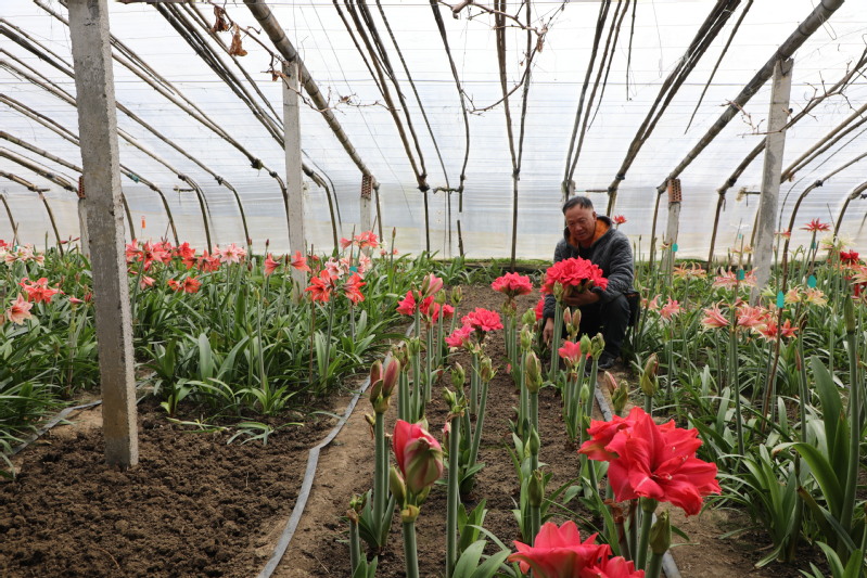 在对朱顶红近乎狂热的的痴迷中,周恒银用了10年时间,引进新品种和杂交选育,储备收藏了现今近200个品种,其中仅自己培育的就达到50个新品种。通过播种、鳞片扦插、分株侧球三驾车并进,苗、球齐发展、同出售。仅2021年销售幼苗就达10万株,种球1万粒,鲜切花万余枝,全年供应上市。力争在2022年培育朱顶红种苗15万株,年销鲜切花2万枝,销售种球2万粒,个人年收入50万元。