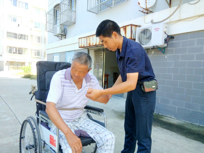 贫困户和独居的老人互相帮扶组成别样的“家”,对老人而言,晚年生活质量提高了;对陈国军来讲,服侍老人的爱心和“家”的氛围,让他的生活更有了奔头,这种互助的形式,既是为行动不便老年人晚年生活提供居家养老的新形式,也是贫困户积极寻求脱贫的一种主动作为,以自己的劳动,过上有尊严的生活。图为陈国军在帮老人疏通筋骨时的镜头。