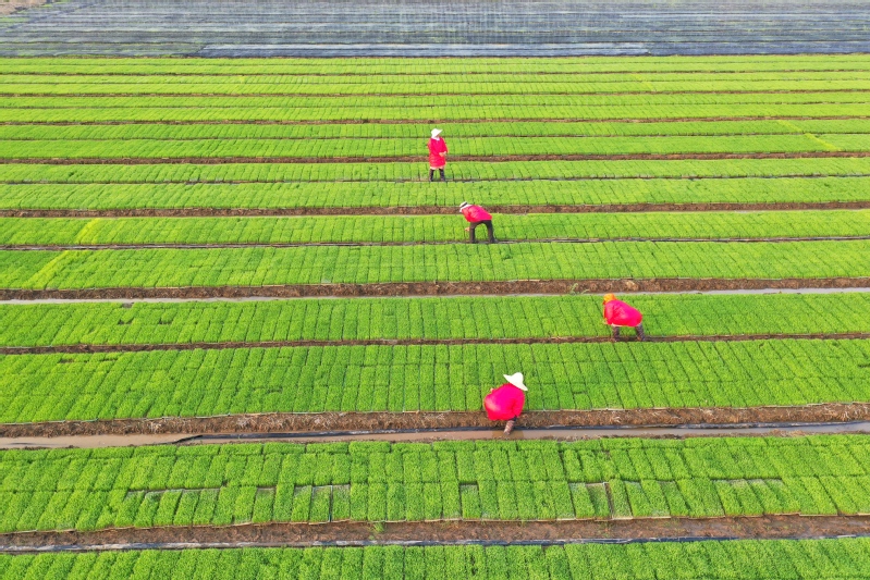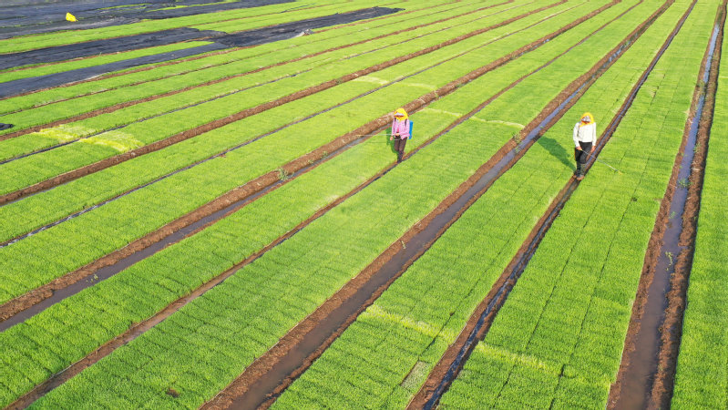 秧好半熟稻,苗好产量高。5月21日,小满,宝应湖农场三生产区职工正在进行小秧管理。