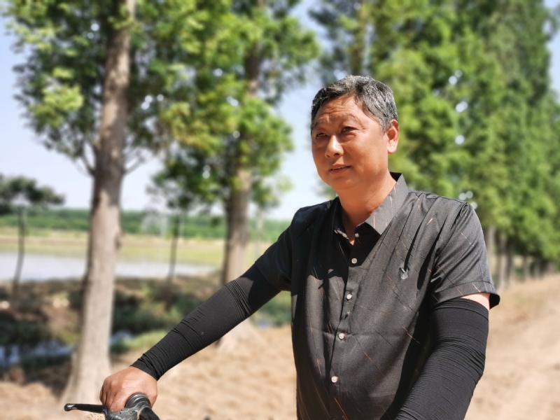 6月15日,一个黑脸、黑衣的身影忙碌在宝应湖12队田间地头,他一会儿守库房和工人一起运肥料,一会儿站田头检查小秧栽插质量,他就是12队“当家人”王国来。