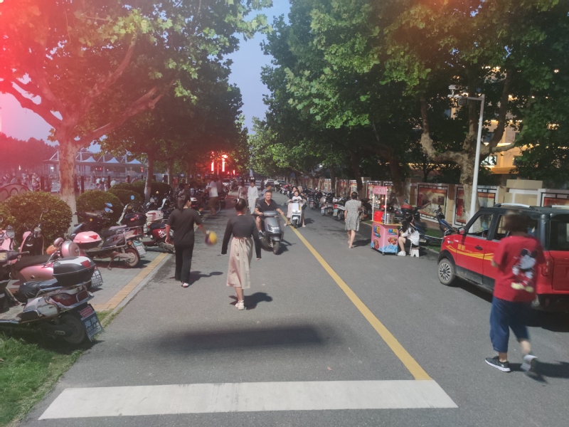 笔者站在广场的门前看了一会儿后发现,尽管每天傍晚来这里健身的人流有上千人,创业路一旁的电瓶车、摩托车车位也十分紧张,但我注意到,许多驾着小轿车来的居民,将车停放在宽阔的淮海路一侧的车位上,不盲目驶往创业路上有限的小车位,而大多数开着轻便车辆的居民,看到出入口旁两侧车子较多的情况下,也会去很远的地方停车再跑回来,大家都能做到文明自觉,给他人方便,也是给自己方便。图为有序停放的车辆。