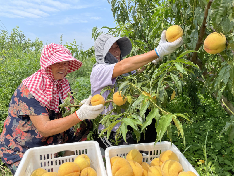 “今年天气比较干旱,我们果园水果的酸甜度更佳,订单量也比往年多出很多,所以园中的采摘工作也更忙碌一些。”基地负责人顾明辉高兴地说。图为果园苗木管理所工作人员采摘黄桃的场景。