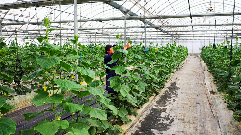 走进智能连栋大棚,一根根精品水果黄瓜挂在藤蔓,翠绿欲滴。瓜农朋友们正赶着有利时节,抓紧采收已经成熟的果实。