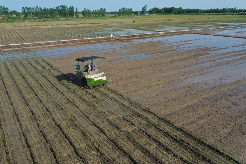 加强栽管,促粮丰产。粮食安全是“国之大者”,全年丰产秋粮也是关键,水稻移栽也是重要环节。俗话说“秧好半季稻”,目前,秧苗长势壮,盘根好,有利于栽插。在第三生产区3500亩有机稻生产基地,5台插秧机、4台运秧车在田间来回穿梭,田间一派繁忙景象。该基地于2021年取得欧盟、国环双认证,产出的有机稻品质优,获得市场认可。目前,全场明确日调度、日研判、日通报、日推进制度,及时协调解决困难问题,千方百计加快小麦抢收进度,确保收割一块旋耕一块。后期将从运秧、栽插、开沟等,进行水稻全程机械化作业,力保水稻种植增产增收。