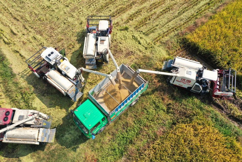 10月17日,宝应湖农场5万亩稻田开镰试割。三四台收割机来回穿梭、相互协作,粒粒饱满的水稻收割脱粒,很快就被装进运输车里,随后运送至场头过磅晾晒。农技人员穿梭在刚收割完毕的田块里,根据收割机的实际收割质量,进行指挥调整,把“丰收在望”变成“丰收在手”。