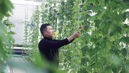 江苏农垦集团云台农场利用资源优势,积极与龙头企业、科研机构对接,开发特色种植。目前,与苏垦麦芽公司订单种植的大棚啤酒花长势喜人。图为技术人员正在为新长出的啤酒花侧枝绕蔓。 程军 摄