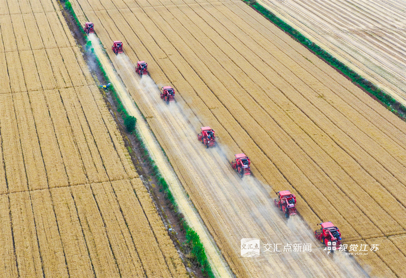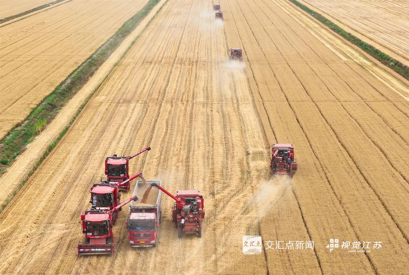 (特约摄影 许昌银 钱厚红 15:24摄 20:39上线)五月的麦田,金穗飘香。5月26日,淮安盱眙洪泽湖畔的江苏农垦三河农场的3.82万亩小麦开镰收割。当地利用晴好天气加紧收割,确保颗粒归仓。