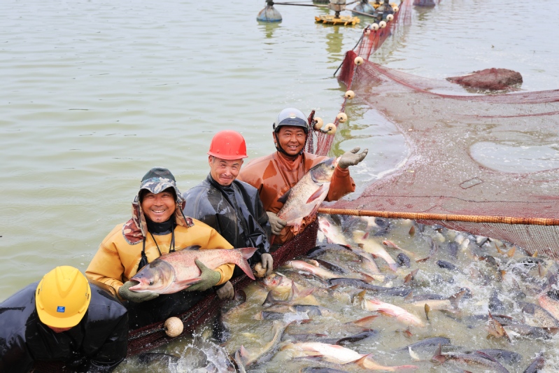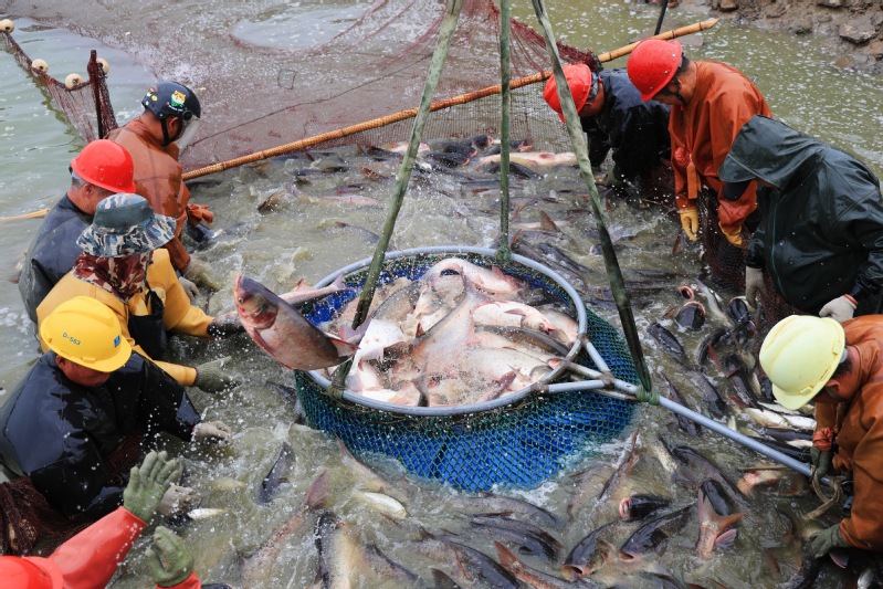 9月15日,江苏省连云港市海州区的江苏农垦岗埠农场,水产工人们在鱼塘里拉网捕捞分拣花鲢、白鲢等水产品,准备发往周边市场销售。