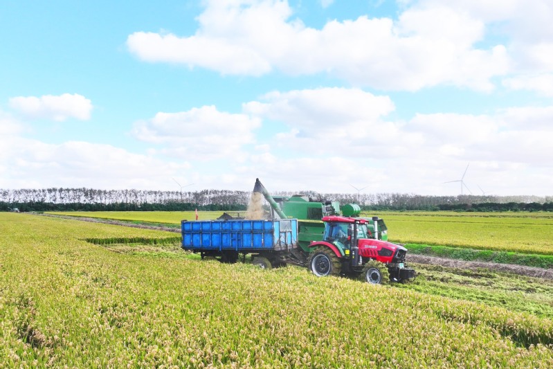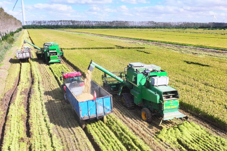 10月22日,在江苏省盐城市射阳县,晴日之下的江苏农垦临海农场,万亩稻田金黄如涛。多台履带式收割机在田间往来穿梭,将颗粒饱满的稻谷源源不断送入运粮车,一幅现代农业抢收的繁忙图景生动铺展。受前期阴雨天气影响,农场以“抢”为令,启用履带式收割机破解湿陷难题,既保障耕地平整,又为后续播种奠定苗齐苗壮基础。同时整合农机与烘干资源,构建“收割一运输一烘干”一体化闭环,全力推进8万余亩水稻抢收,为筑牢粮食安全屏障争分夺秒。