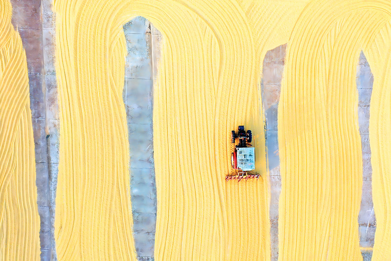 10月27日,连云港市海州区的江苏农垦岗埠农场,职工驾驶粮食翻晒机械在场上来回穿梭,翻晒刚刚收获的水稻。 陶桂军 严连凤 摄(视觉江苏网供图)