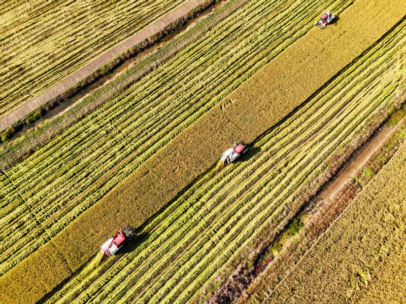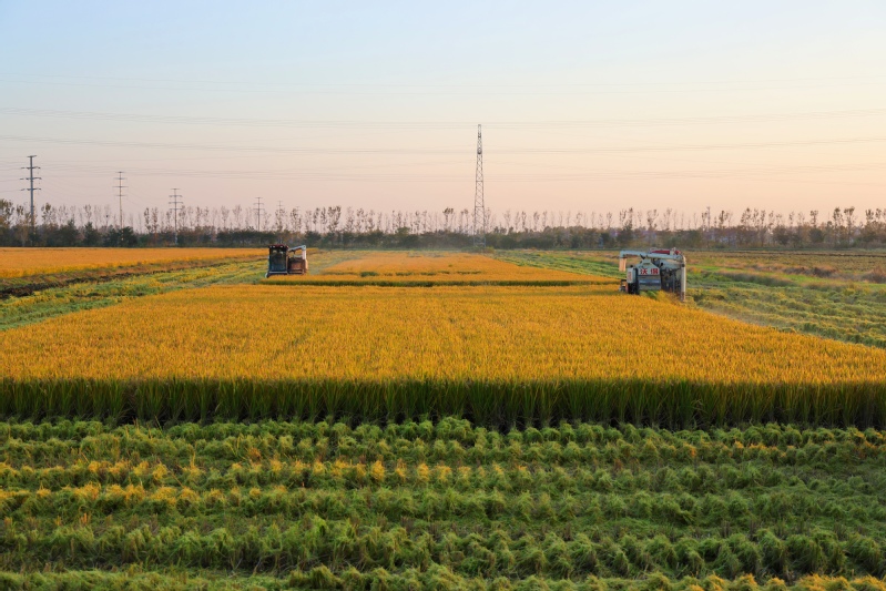 11月2日,在江苏省连云港市海州区江苏农垦岗埠农场的高标准农田里,职工们利用晴好天气,积极开展水稻抢收工作,确保不误农时、颗粒归仓。