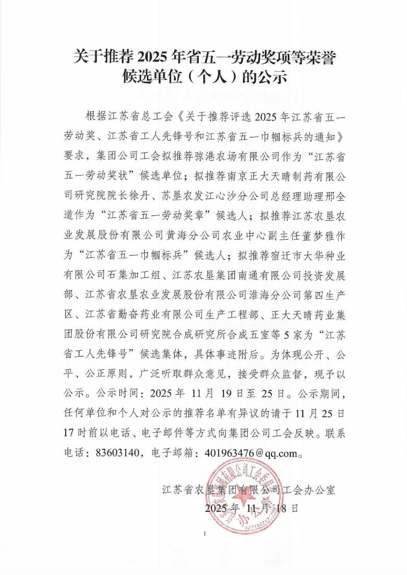关于推荐2025年省五一劳动奖项等荣誉候选单位(个人)的公示