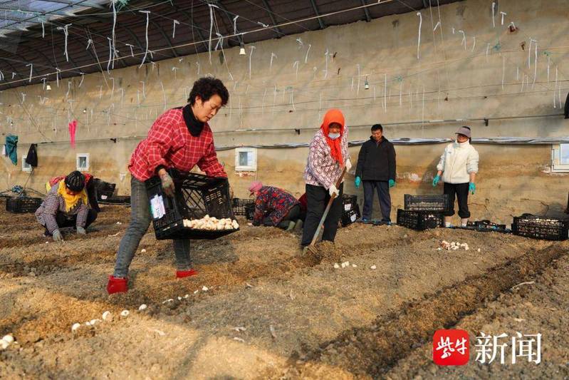 清晨,第一缕阳光穿透薄雾洒向连云港市海州区岗埠农场高效农业示范园,28号温室大棚内暖意融融,近20名工人分工协作,锄沟、摆种球、栽种、培土……动作娴熟、衔接紧密,一派热火朝天的劳作景象,为今冬海州“美丽经济”续写着增收新篇。