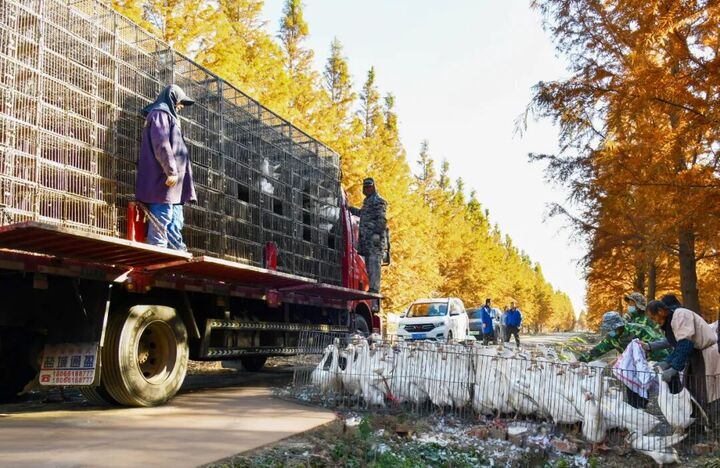 淮海农场肉鹅养殖基地内,运鹅车辆整齐排列,现场忙碌而有序。工作人员分工协作,撵鹅、抓鹅、装笼,动作娴熟,一气呵成。这是淮海第三批生态肉鹅集中出栏,共3000余只,个个膘肥体壮,平均体重达到5公斤。由于品质上乘,一周前便被客户预订一空,即将直供周边市场,成为大家年夜饭桌上的一道“硬菜”。该基地采用“林—草—鹅”循环养殖模式,将肉鹅散养于中山杉林间,以杂草为天然补充饲料。不仅降低了饲养成本,也有效解决了林下除草难题,同时为鹅群提供了充足的活动空间,减少了防疫压力,也显著提升了鹅肉的紧实度与风味。淮海肉鹅上市后,便成为周边市民春节菜篮子里备受青睐的“绿色年货”。