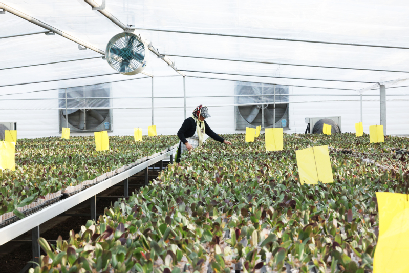 2月17日,云台农场兴垦科技员工在整理啤酒花藤蔓(上图)。2月17日,云台农场兴垦科技工作人员在整理蝴蝶兰育苗(下图)。