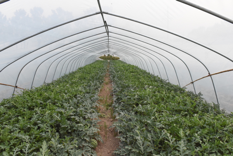 走进位于淮海农场三分场社区十五、十六大队的西瓜种植基地,就看到依条田走向搭建了跨度7米,长度依条田的宽度而定非常壮观的大棚,每个大棚内瓜秧遍布、滚圆的西瓜突兀在绿色的瓜蔓上。