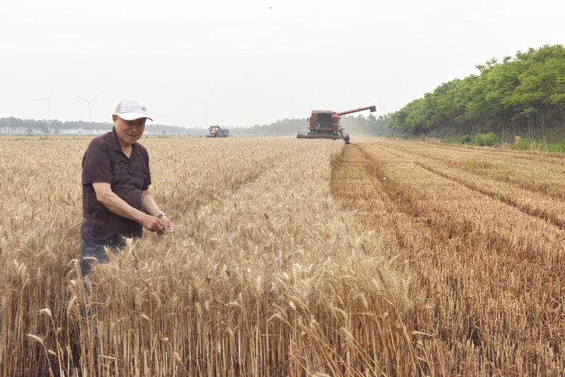 麦到小满日夜黄,芒种前后机收忙。走进六月的淮海大地,目光所及之处是一片金黄,沉甸甸的麦穗低头弯腰,金灿灿的麦粒圆润饱满。由于连日来的高温,让麦小麦的成熟时间提前了不少。我们看到一辆辆大型收割机前边刚收割,紧随其后的就是耕地机械、筑埂机械、平整机械和机插或直播机械等,一台台现代化的大农机驰骋田间,吃进去的是金黄色的麦穗,吐出来的是金色的麦粒,喷撒出来的也是金黄色的麦稭草,收割、拉运、整地、机播机插等一条龙机械作业,全部机械运作在几天内完成,简洁高效。放眼望去,田间地头尽显忙碌景象,也让人们在观赏中,感受到了淮海大地处处丰收美景。