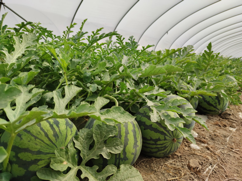 走进还没有采摘的瓜棚内,大棚内西瓜分栽在棚的两侧,中间的一条小道两侧,座满了一个个硕大的西瓜,简直是挨排排地座落在一起,让人看了十分喜爱。