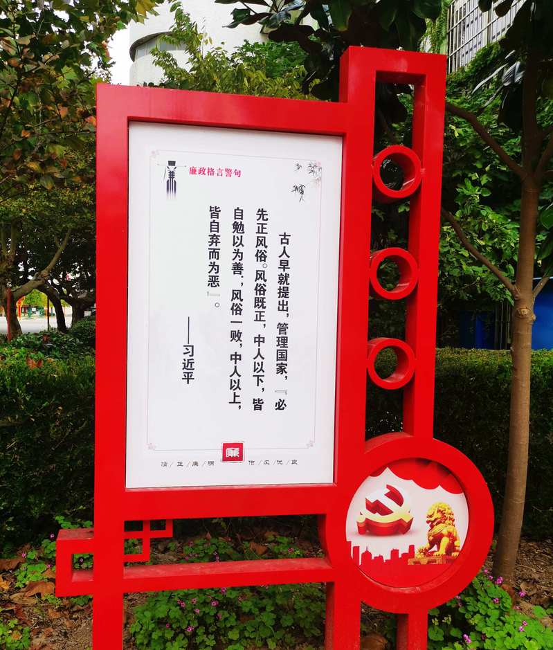 廉政法治文化宣传栏,内容丰富,形式活泼,常常吸引群众纷纷驻足。广场四周设立20多块宣传标牌,既装饰美化了环境,又充实了思想政治内容,人们或漫游信步,或静坐小憩,目及之处,廉政法治文化清新醒目,引人入胜。廉政文化步道两侧是廉政文化小故事,有历史名人的廉政传说,也有当代伟人的廉政典故。间插格言警句、法律法规、廉政建设等方面的内容。造型别致,内容深邃,通俗易懂,老少咸宜。法治宣传LED大屏循环播放法治宣传教育警示片,是群众吸收信息、接受教育的现代化窗口。