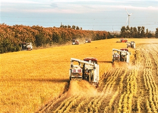 11月3日,江苏省盐城市射阳县新洋农场组织收割机械,对高标准农田中的优质水稻进行抢收作业,确保秋粮颗粒归仓,不误农时。 作者:张伟生