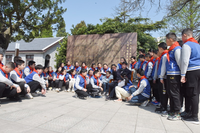 “1952年4月,我们农建四师的万余官兵来淮海农场屯垦戍边的路途中,即便是下雨天也从不扰民,夜晚老百姓的屋檐下、草堆旁官兵是席地而睡,让老百姓深受感动。”4月14日上午,在农建四师大院内的毛泽东发布的“农业建设、生产待命”命令碑文前,89岁的原农建四师战士胡福生正在给射阳县淮海小学六年级的学生讲党史场史,“‘不与民争地、不与民争利’列入了农场的建场方针,我们共产党人是千方百计地保护农民群众的利益。”