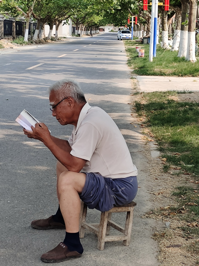 农场公司党委先行从抓好在职党员学习阅读“四本指定用书”开始,让大家读原著,学原文,悟原理。在反复阅读这部重要著作中,不断增进感情,强化阅读自觉性主动性,从而发自内心深处地去钻研之,从而形成心灵的认同。继而将学习“四本指定学习用书”覆盖到全体离退休老党员中。农场的老党员不仅是淮海开荒建场功臣,是农场的宝贵财富,也是农场实施高质量发展提质增效的重要资源,更是推动农场公司党史学习教育活动扎实有效开展的重要力量。考虑到老党员们年事已高,集中学习不便,为确保党史学习教育的全覆盖,不缺课,不掉队,农场公司党委结合实际情况,以各基层党支部为单位,为离退休党员开展“送学上门”活动。将党史“四本指定学习书籍”送到每一位离退休老同志们的家中,鼓励他们继续发挥党员的先锋模范作用,为农场的发展贡献自己的力量和智慧。让老党员们足不出户就能了解到党史学习教育新思想新的要求,同时也让他们感受到了来自组织的关怀和温暖。图为老党员王老在路边荫凉下学党史时的镜头。